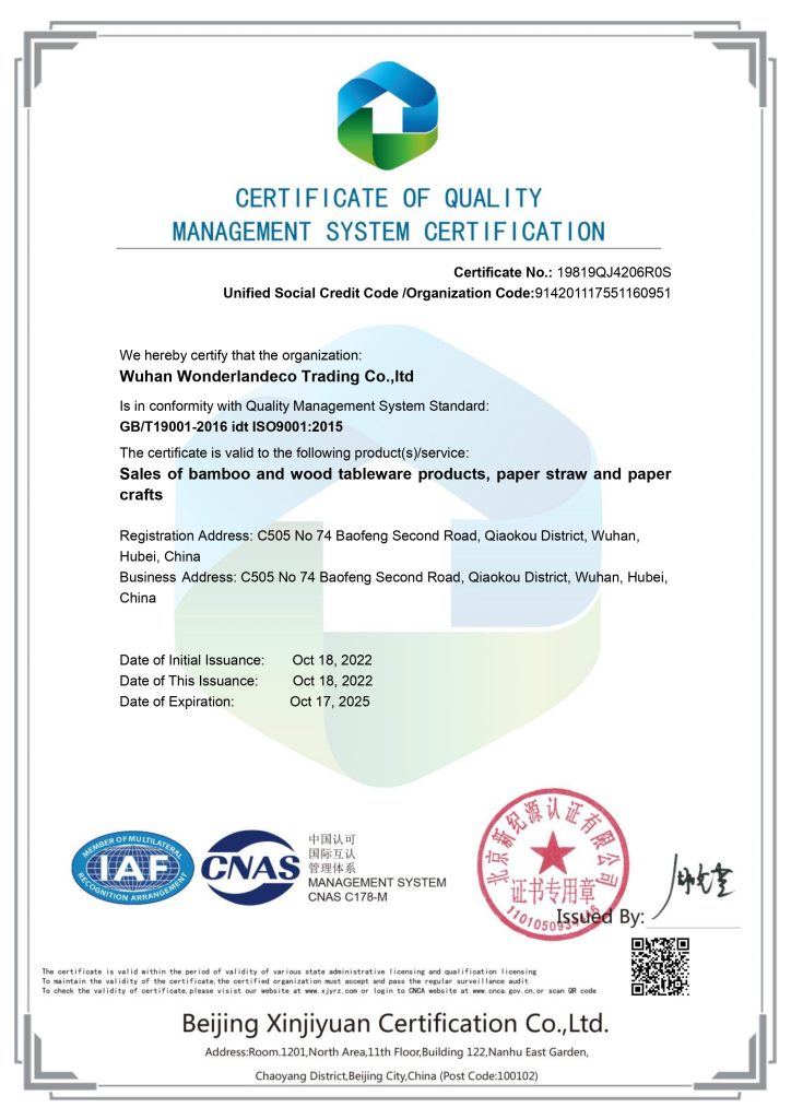 wuhan wonderlandeco has passed through international quality control standard BSCI and FSC.And all of our products can reach LFGB REACH and FDA test standard.
